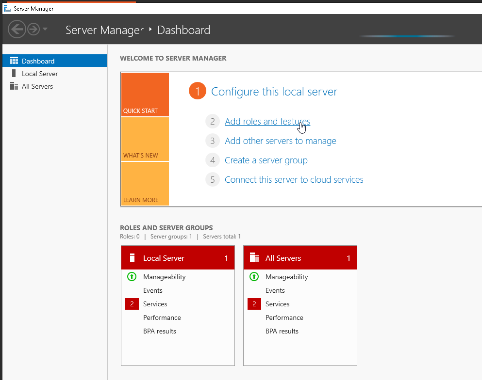 - From search bar, type Server manager and click the result to open the Server Manager dashboard.