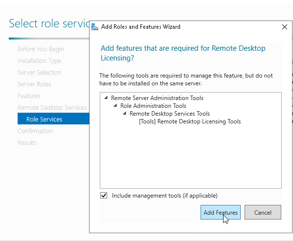 - On the Role Services page select Remote Desktop Licensing and Remote Desktop Session Host, then click Next and then click Add Features